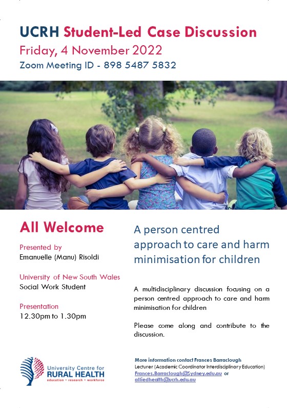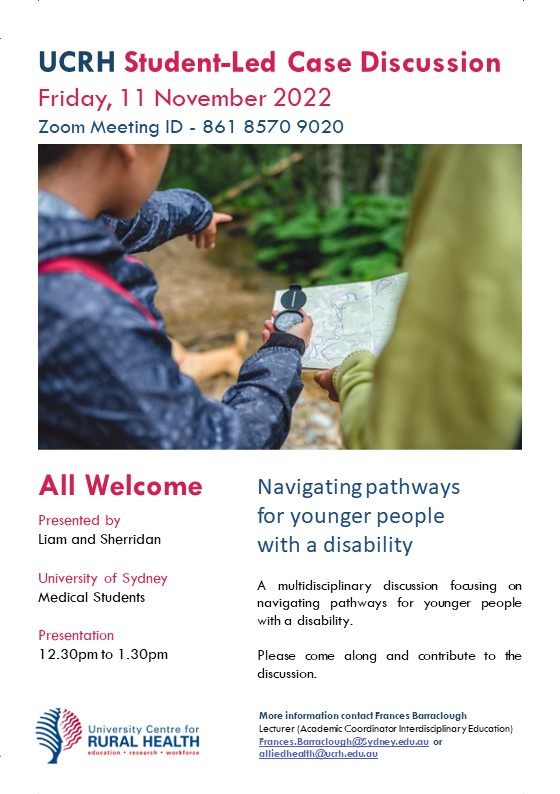 Case Discussion: Navigating pathways for younger people with a disability When: Nov 11, 2022 12:30 PM Canberra, Melbourne, Sydney Register in advance for this meeting: https://uni-sydney.zoom.us/meeting/register/tZIsf-yvrjIqGNR515zNPsvHGiAbugMoNMBb